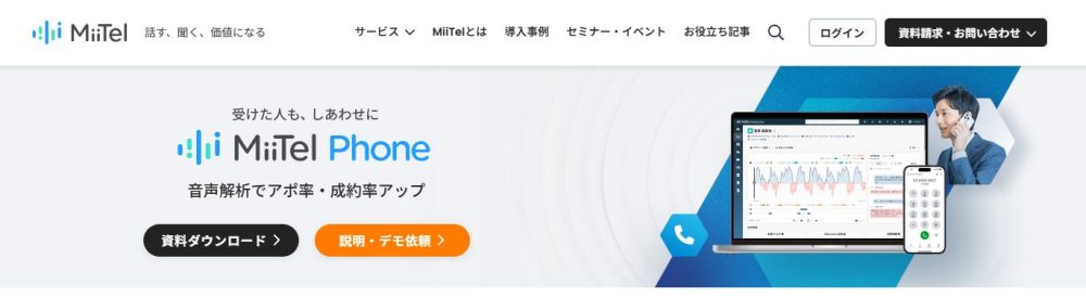 MiiTel Phone(ミーテルフォン)は「電話解析AI」を標準搭載した営業・コールセンター特化型のクラウドIP電話です。通話内容をAIが自動録音・文字起こしするだけでなく、話速・トーク比率・ラリー回数・沈黙時間などを定量データとして可視化します。これにより属人的だった営業ノウハウを組織全体で共有・再現することが可能になります。