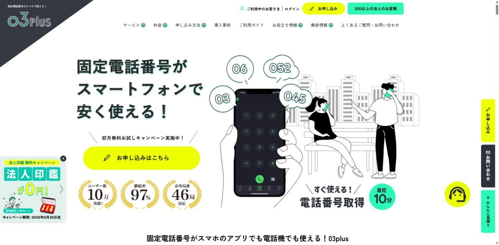 03Plusは「03」「06」など全国46の市外局番をスマートフォンで使えるクラウドPBXサービスです。ユーザー数は5万人以上、大阪市などの公的機関でも採用実績があります。申し込みから開通まで全てWebで完結でき、法人代表者名義であれば最短即日開通が可能です。