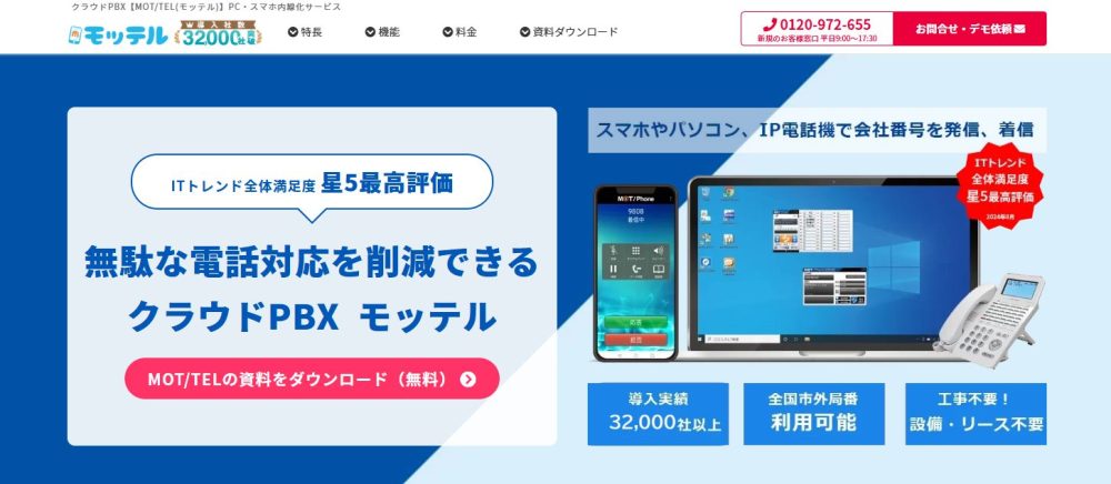 MOT/TEL(モッテル)は、10年以上の開発実績を持つ日本製クラウドPBXです。シリーズ累計導入実績は32,000社超を誇り、ITトレンドのPBXカテゴリー満足度ランキングNo.1を獲得しています。スマホアプリ・PCソフトフォンともに日本人向けのUIを追求して設計されており、使いやすさと安定性を両立しています。
