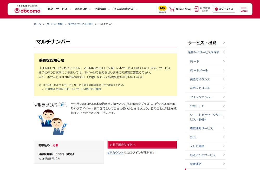 この停止に伴い、3Gを前提とした複数のオプションや機能も整理される見通しで、マルチナンバーについてはすでに新規契約の受付を停止しているという告知もあります。