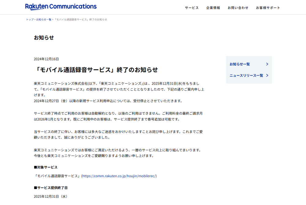 楽天モバイル(楽天コミュニケーションズ株式会社)が提供している「モバイル通話録音サービス」が、2025年12月31日をもって提供終了となることが正式に発表されました。