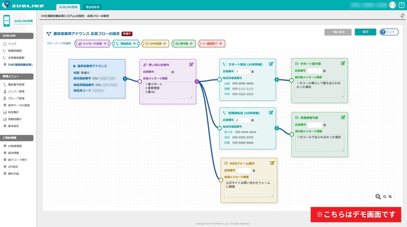主に各事業の電話受付時の一次対応として、自動音声応答機能をフル活用しています。IVRのアナウンスで用件を振り分け、自分自身が直接対応すべき重要な電話のみを受ける体制を構築しています。IVRで対応しきれない場合は、留守番電話やショートメール(SMS)を活用して後ほど対応するようにしています。基本は受電用ですが、必要に応じて050番号からの発信も行っています。